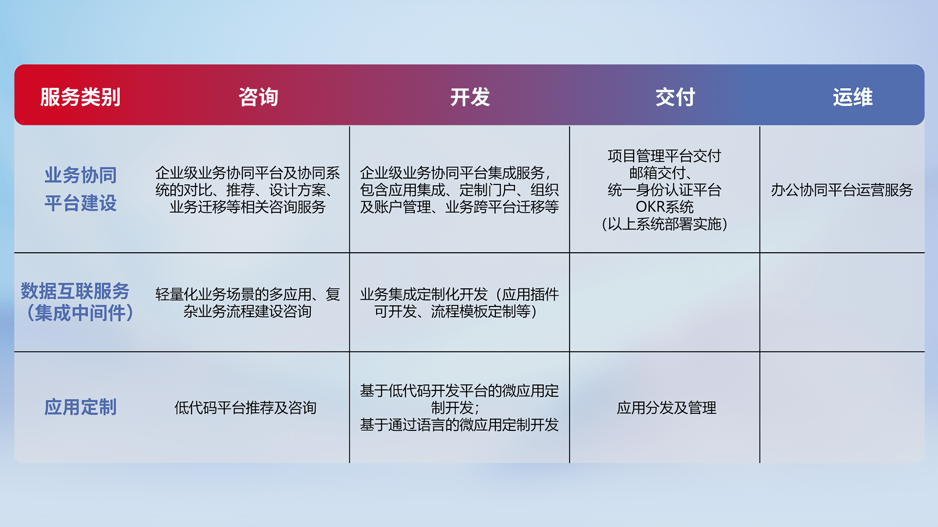 针对钉钉、、、企微、、、、IDaas等平台级产品提供产品的规划、、方案、、交付、、、定制化开发等服务,,,,实现如统一协同办公、、、智能客户服务、、、混合会议管理、、、智能数据查询、、、等业务场景,,实现数字化转型。。